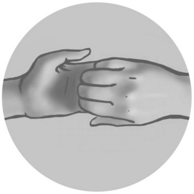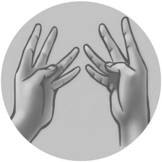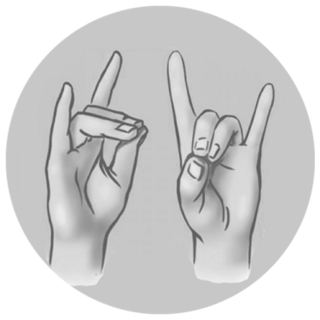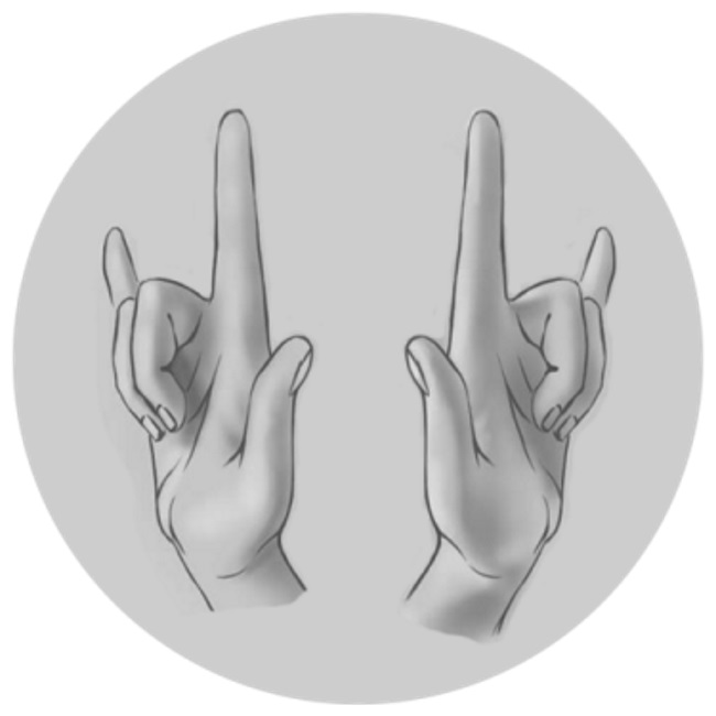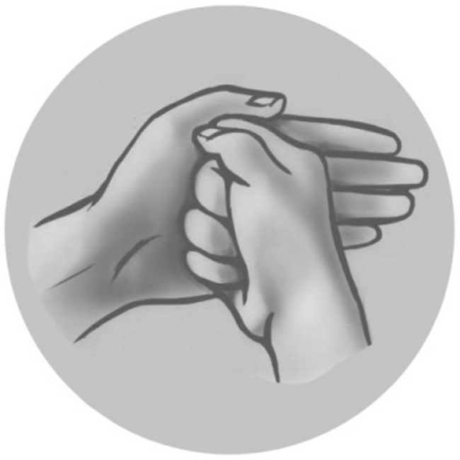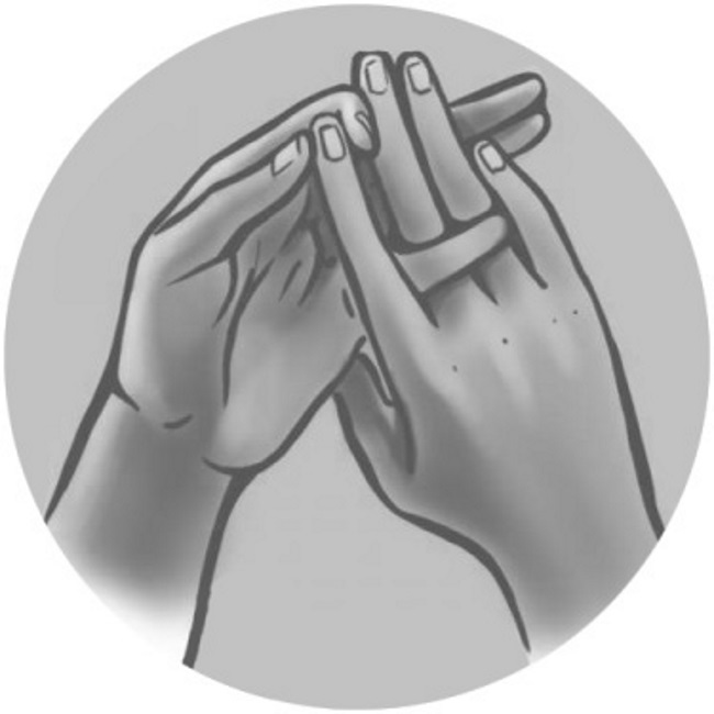 Coloca los dedos medio y anular de la mano derecha sobre los dedos correspondientes de la mano izquierda. Introduce el meñique de la mano izquierda cerca de la base de los dedos medio y anular de la mano derecha, desde la parte posterior de la mano. Luego, fija su posición con el dedo meñique de la mano derecha. Falange terminal del índice de la mano derecha fíjalo entre el pulgar y el índice de la mano izquierda.
