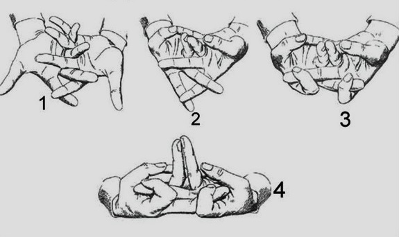 Coloca tus dedos, a excepción de los pulgares, en forma de «peine». Usa los pulgares para alcanzar los dedos meñiques de la mano opuesta. Los anulares ponlos en posición vertical. Es deseable que estén rozando uña a uña. Con los índices agarra los dedos medios de la mano opuesta y tira hacia el centro de la palma. Parece que es muy difícil de realizar, pero solo empieza y verás que ¡pronto tendrás éxito!