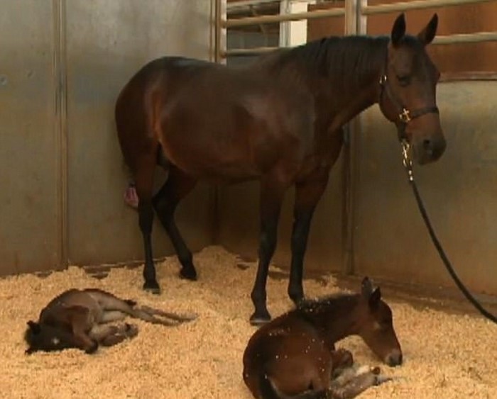 Emma dio a luz a dos potros a la vez. Bien se puede llamarlos gemelos, aunque es un caso inusual para los animales. Los gemelos llegan al mundo muy raramente. ¡Las posibilidades de un nacimiento exitoso en este caso son de solo 1: 10 000!