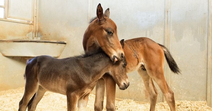 Emma dio a luz a dos potros a la vez. Bien se puede llamarlos gemelos, aunque es un caso inusual para los animales. Los gemelos llegan al mundo muy raramente. ¡Las posibilidades de un nacimiento exitoso en este caso son de solo 1: 10 000!