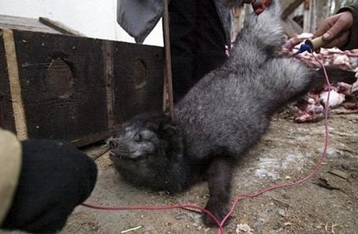 En este estado, las pobres bestias vivían por varios años, antes de que los dueños se deshicieran de ellos por el método tradicional: matándolos con la ayuda de la corriente eléctrica. A los infelices les insertan un alambre en la boca y en el ano, y, a continuación, dejan que la electricidad fluya a través del cuerpo. Este método está muy extendido en la cría de pieles…