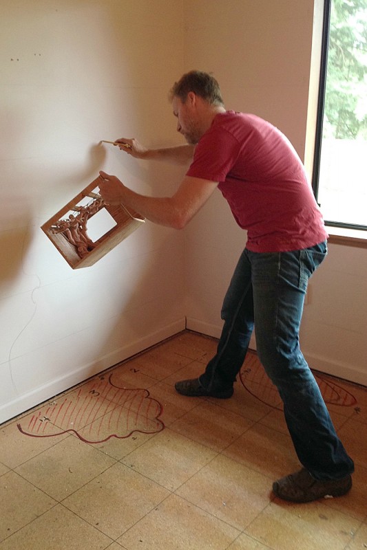 Las paredes y el suelo del cuarto fueron minuciosamente marcados con contornos del futuro árbol.