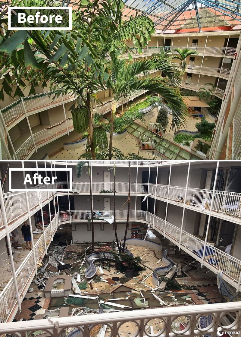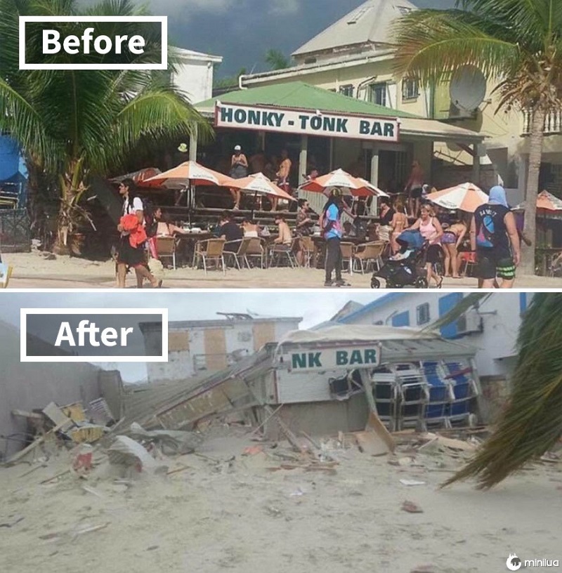 Un popular bar en las Islas Vírgenes, antes y después de la llegada de la Irma.