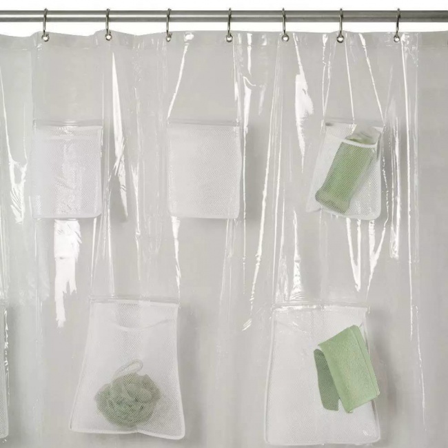 Coloca bolsillos de malla en la cortina de tu ducha. Podrán serte de gran utilidad, para tener a mano todo lo que necesitas a la hora del baño.