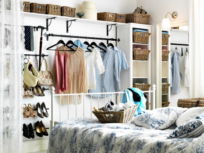 Puedes utilizar canastas en lugar de repisas. Si las fijas a la pared, obtendrás un elemento decorativo muy funcional.