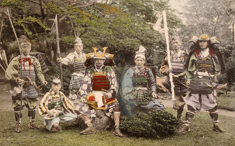 Un grupo de guerreros samuráis con la armadura tradicional, 1870.