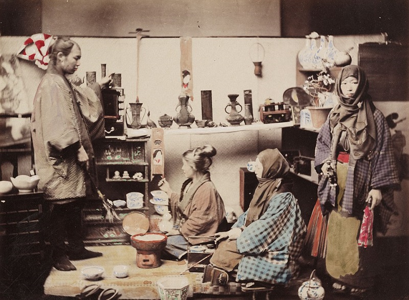 Mujeres japonesas, con trajes nacionales en una tienda. Foto de finales del siglo XIX.