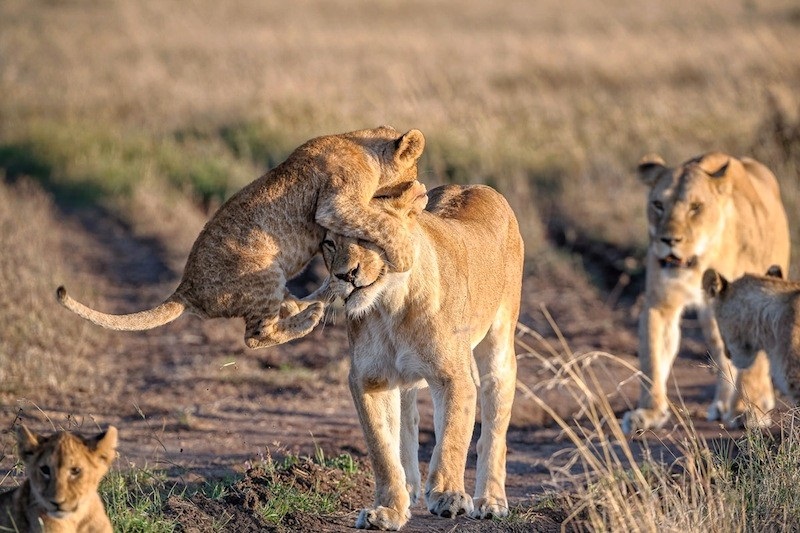 Este cachorro de león juega con su madre, brincando sobre su cabeza. La fotografía fue tomada por Marja Schwartz en Naboisho, Masair Mara, Kenia.