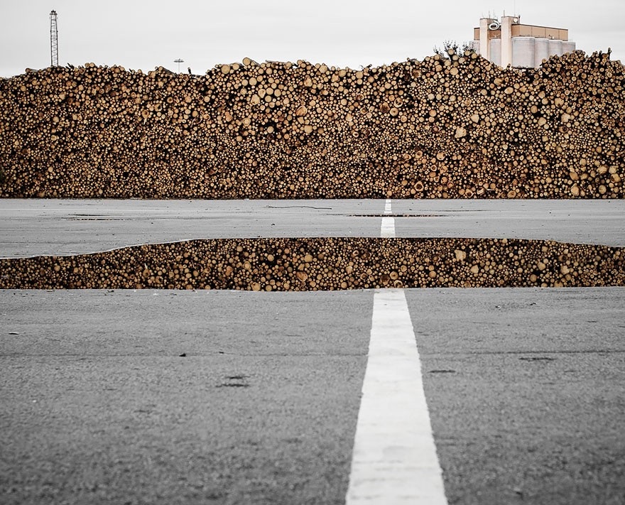 Apuesto a que te quedaste desconcertado. Esto no es más que un reflejo de madera apilada, en un charco de agua.