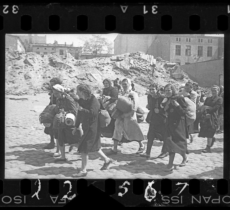 Un grupo de mujeres cerca de las ruinas de la sinagoga, a la espera de su traslado, 1940-1944.