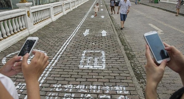 En Chongqing, para las personas que no pueden separar sus ojos de los teléfonos, se han hecho caminos especiales para evitar que, inadvertidamente, lastimen o mutilen a otros.