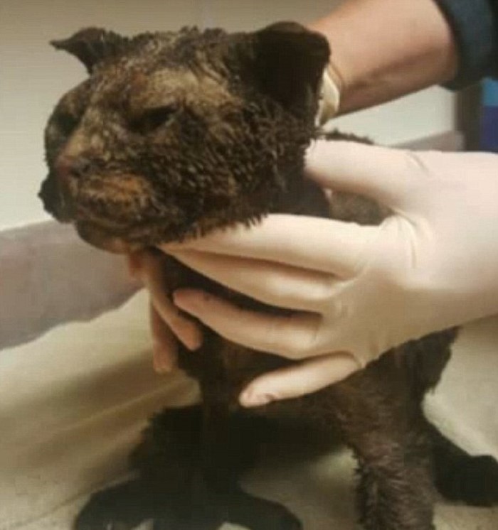 Totalmente quemado, el animalito fue descubierto por el bombero retirado Steve Wright. Él vio unas llamas procedentes de un campo de maíz, ubicado en la parte trasera de su casa. Al darse cuenta de la presencia de fuego, al instante se precipitó allí. Al llegar, Steve vio al gatito, casi sin vida, tirado en medio de un charco.