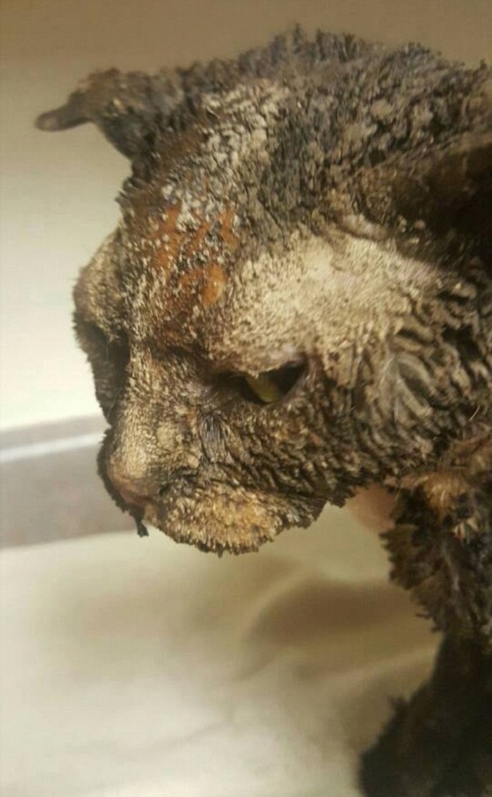 Totalmente quemado, el animalito fue descubierto por el bombero retirado Steve Wright. Él vio unas llamas procedentes de un campo de maíz, ubicado en la parte trasera de su casa. Al darse cuenta de la presencia de fuego, al instante se precipitó allí. Al llegar, Steve vio al gatito, casi sin vida, tirado en medio de un charco.