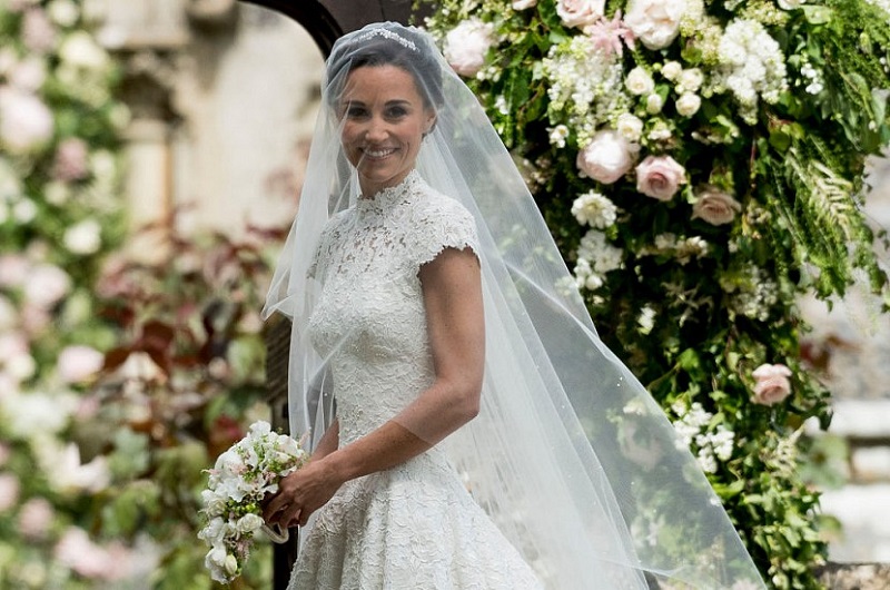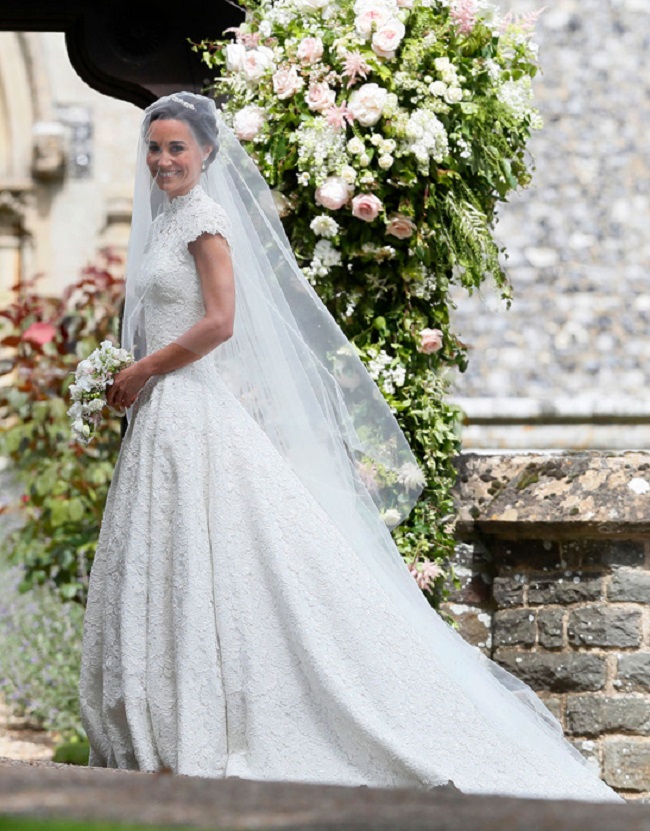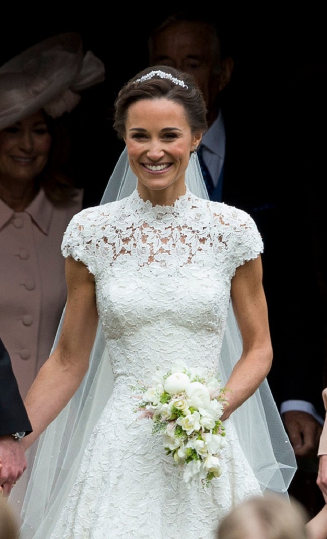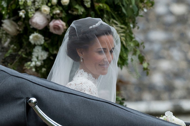 Pippa Middleton, de 33 años, apareció ante los invitados con un lujoso vestido de encaje con un pequeño escote en la espalda, una elegante tiara y un largo velo de novia.