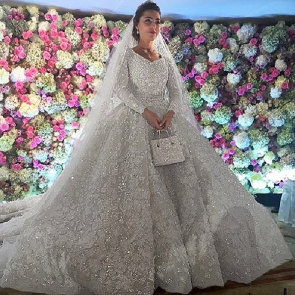 El vestido de la novia fue hecho a la medida en Francia por los diseñadores de casa de moda Elie Saab y costó $ 25.000. El peso del vestido, decorado con piedras preciosas, era de casi 13 kg.