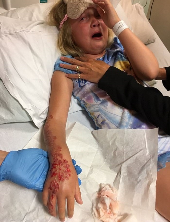 Una sensación de ardor y el dolor insoportable la hicieron llorar. Pero cuando se lavó el tatuaje, ya era tarde – numerosas ampollas se habían formado debajo de la piel, ocupando la mitad del brazo. Después de haber hecho análisis del líquido contenido en las ampollas, los médicos diagnosticaron una quemadura química.