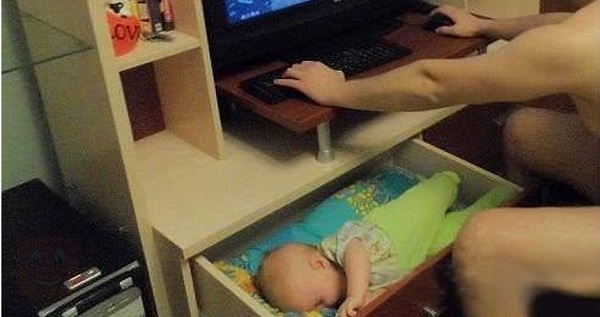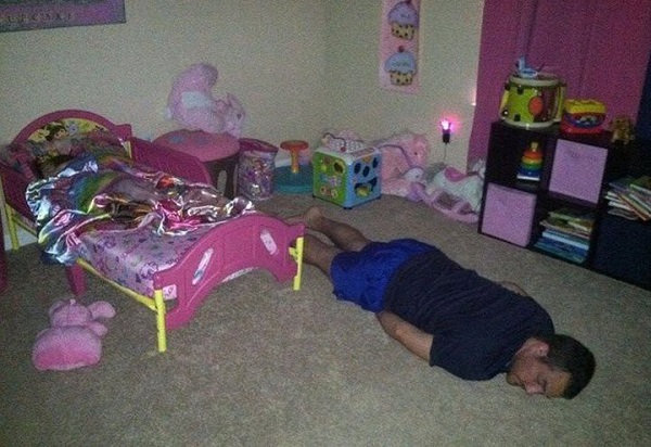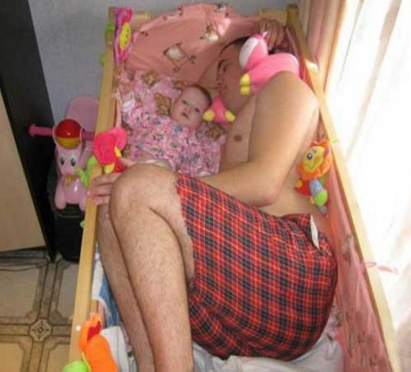 Incluso el papá se rindió, y el bebé todavía sigue despierto.