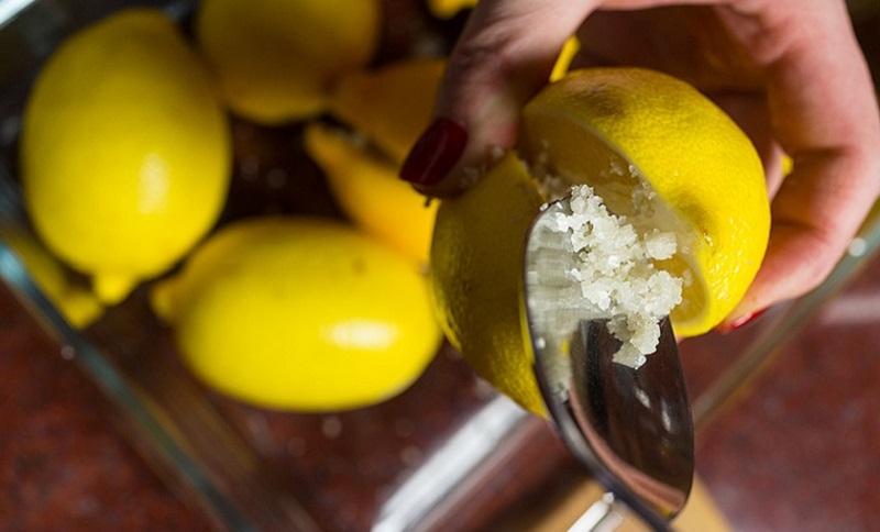 2. En cada incisión échale una cucharadita de sal. Entonces apisona cuidadosamente los limones en un frasco esterilizado.