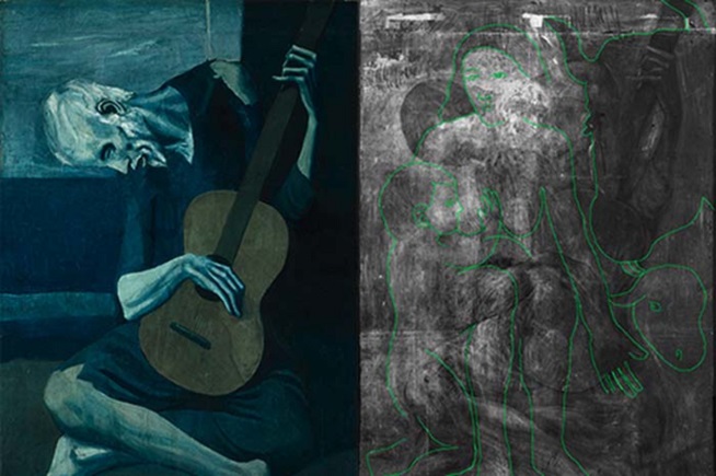 Para el arte de Picasso, aún sin ser reconocido, hubo muchos años para nada beneficiosos. Precisamente por eso, en aras de ahorrar materiales, el artista reutilizaba viejos lienzos para sus nuevas obras. Esto fue lo que le sucedió a la obra «Viejo con guitarra». Luego de un examen exhaustivo se hizo evidente el contorno de otra figura. Los rayos X confirmaron que se trataba de la imagen de una mujer con el niño en una campiña rural.