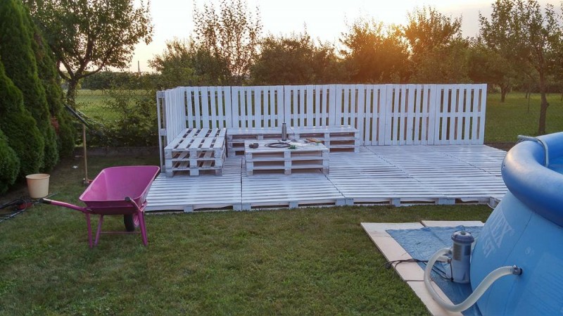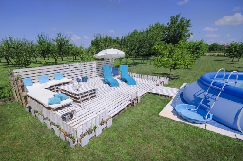 Por ejemplo, con la ayuda de los palets se puede construir hasta tu propia piscina. ¡Qué pasada! te ha preparado una demostración de cómo hacer un estupendo lugar para relajarse en el jardín. Aquí tú podrás sentarte a tomar el sol, relajarte y charlar con tus amigos, mientras estés disfrutando de una limonada fría.