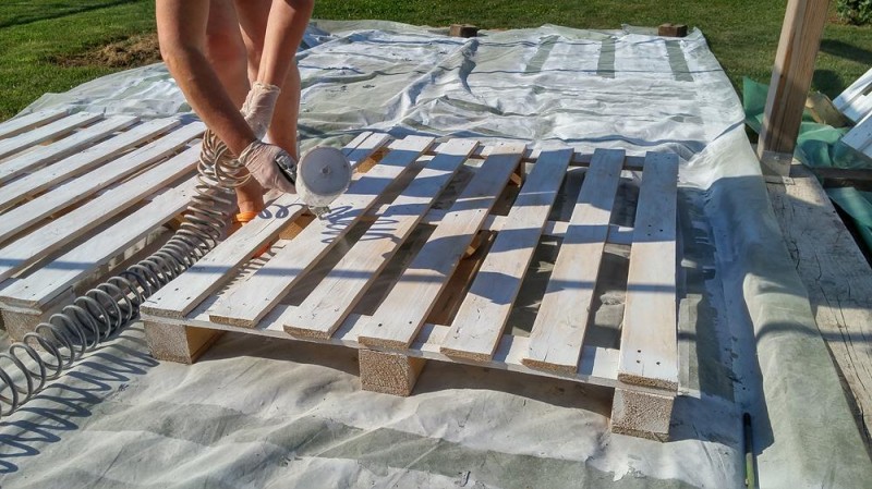 Con la ayuda de una amoladora angular y papel de lija, dale acabado a los palets.
