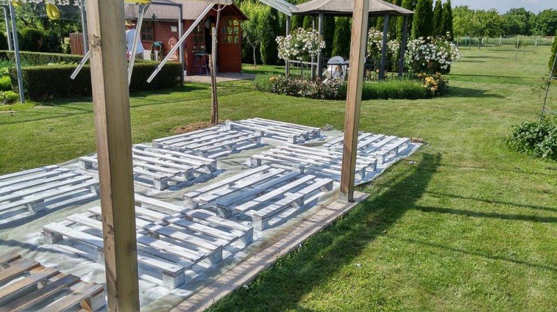 Como base para la zona de recreo, es adecuado usar una lona de jardín. Esto se hace para que el agua de lluvia no se acumule debajo de los palets.
