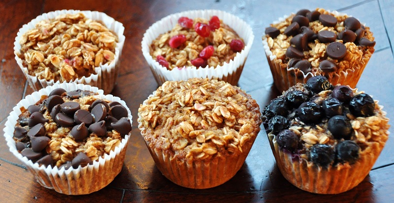 - Rellena los moldes con la masa de harina de avena por 2/3. Espárcele varios aditivos (a elección): nueces, chocolate, frutos, semillas.