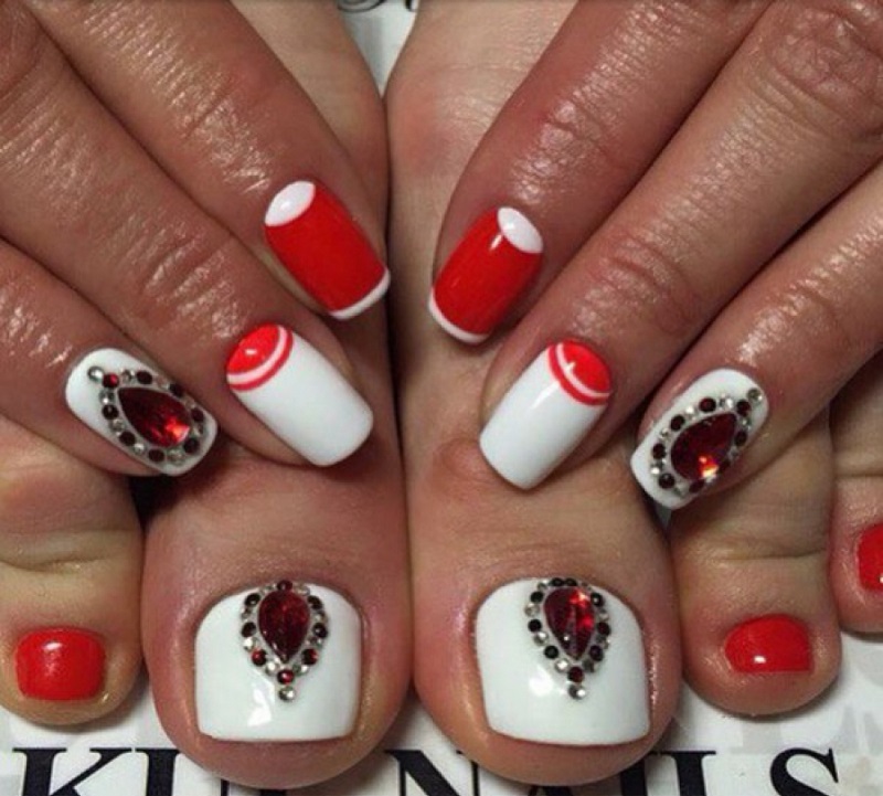 - ¡Una opción elegante para la celebración! Manicura roja de luna con piedras será seguramente envidiada por tus amigas. La pedicura no está sobrecargada con nada, el énfasis principal está en el pulgar con el diamante de imitación.