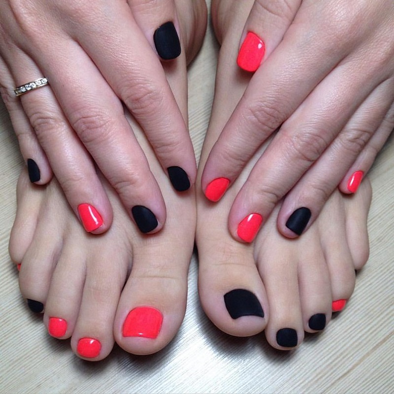 - El mismo color para las uñas de las manos y los pies no siempre es aburrido.