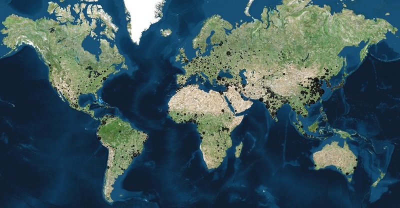 Mapa con las ciudades, donde la población es más de 100 000 habitantes. Hay 4 037 de estas ciudades.