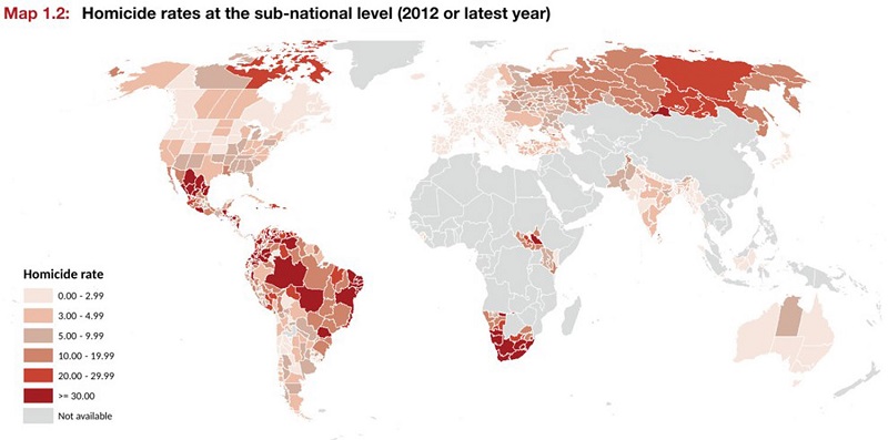 Mapa del mundo basado en la frecuencia de asesinatos.