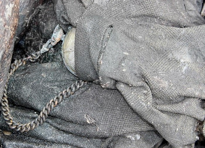 Identificar los restos resultó ser bastante fácil. La mayoría de las cosas estaban perfectamente conservadas. Por ejemplo, he aquí el reloj de bolsillo del Sr.Dumoulin, y las botas con suelas de herraduras, usadas por su señora.