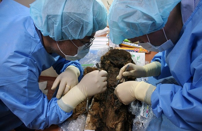 La momia fue retirada con sus ropas de pieles, directamente del pozo funerario. Los científicos decidieron sacar el cadáver del capullo, por miedo a perder algo importante.