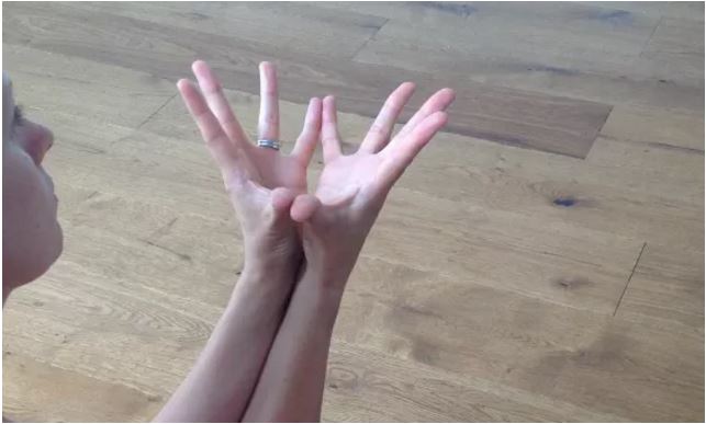 Con el dedo pulgar, empuja hacia el centro de la mano el dedo anular, estirando los demás dedos hacia adelante.