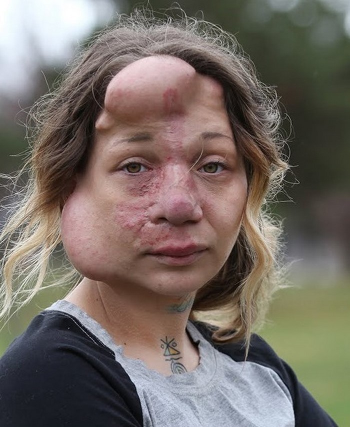 Para hacer frente finalmente a su maldición inherente, la mujer decidió hacerse una operación muy compleja. Pero antes de eso, ella tuvo que conformarse durante unos meses con unas bolas insertadas en la cara.