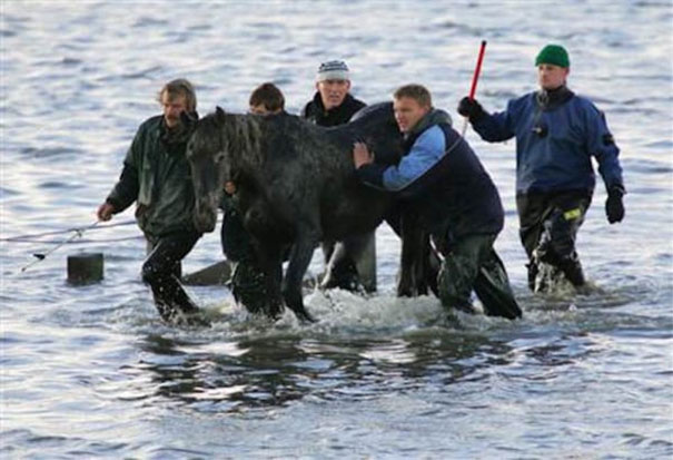 Ninguna de las tentativas de rescate tuvo éxito. Un post en un foro, solicitando la ayuda de jinetes experimentados con caballos sin miedo al agua, fue la solución.