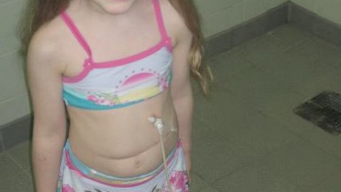 Por ejemplo, la nena sufre de síndrome del intestino corto. A causa de esto, tiene que llevar permanentemente un tubo insertado en su vientre, a través del cual su cuerpo recibe los nutrientes necesarios para vivir.