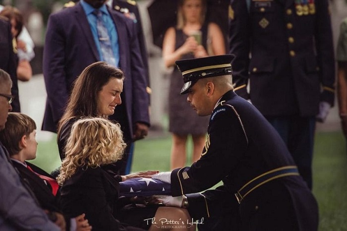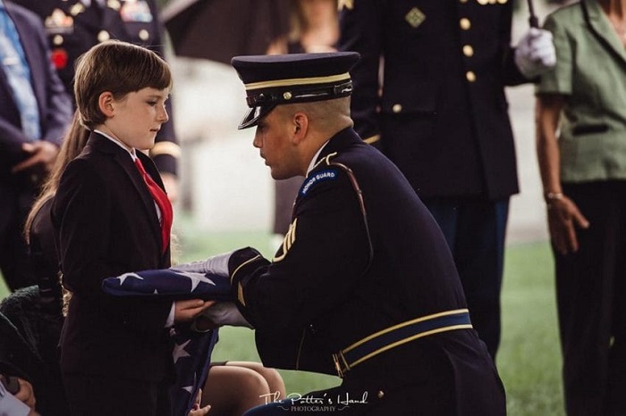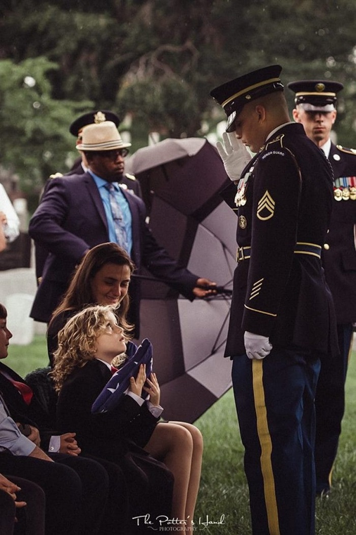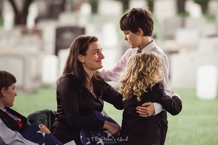 Antes de salir del cementerio, el hijo menor tenía algo más en mente. Quería abrazar a papá, y decirle adiós. Kate Brazel confía en que los niños recordarán a su padre por siempre.