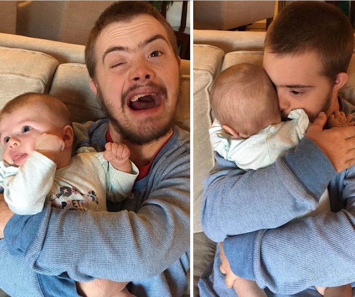 «Mi hermano tiene síndrome de Down. Siempre le ha gustado tener niñitos pequeños en sus brazos, sin embargo, pero pocas personas se lo permiten. Mi esposa y yo le dimos a cargar a nuestra bebé hoy. ¡Solo mira sus ojos y reacción cuando le dieron el niño! Él no se movió durante cinco minutos. Casi lloro».