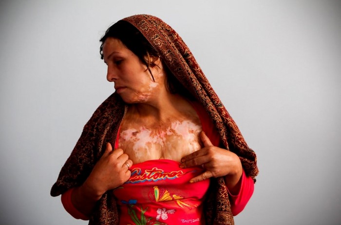 Para salvarse de la crueldad y la violencia, las mujeres en los países del este son capaces de sacrificar su propia apariencia. En la foto de abajo, Rahime, de 30 años, muestra cicatrices de las quemaduras que recibió cuando ella misma se vertió queroseno, hace 16 años.