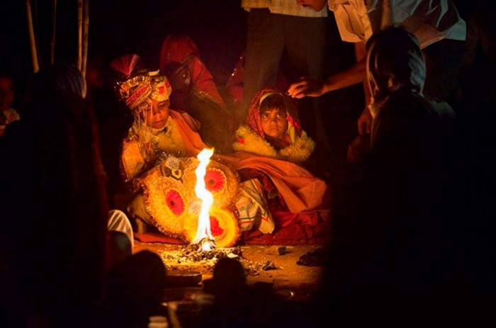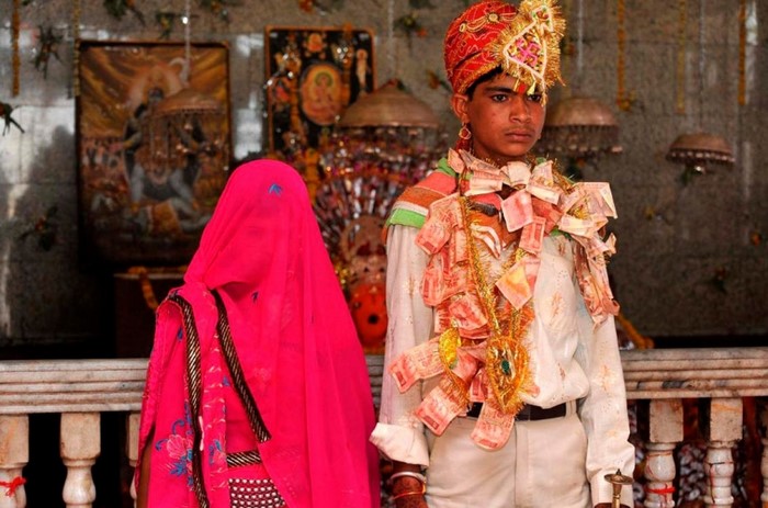 Como se mencionó anteriormente, los matrimonios precoces en la India no pueden considerarse una rareza. La siguiente imagen muestra un fragmento de la boda que tuvo lugar en Bhopal. Aquí, un niño de 14 años se va a casar con una niña de 12 años. Chicos como estos, a menudo perciben el complejo ceremonial como un juego, y enfrentan la edad adulta aun siendo niños.