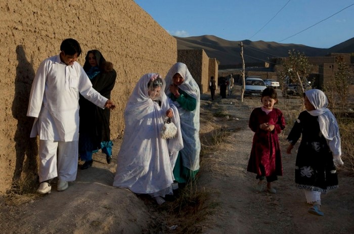 El mismo patrón se observa en muchos países del este. La siguiente imagen muestra una ceremonia de boda en la provincia afgana de Bamiyan. Los matrimonios de este tipo son comunes aquí. Estas bebés no tienen infancia: la familia suele apresurarse a casar a la niña lo antes posible, librándose de la «carga».