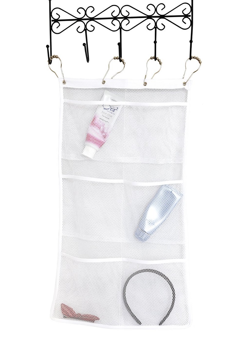 Este organizador de secado rápido es un dispositivo indispensable para ducharse. En sus bolsillos puedes colocar el jabón, la esponja, los geles, y otros accesorios para la ducha.