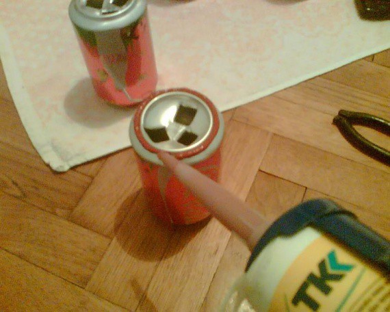 1. En primer lugar, selecciona las latas de cerveza o de cualquier otra bebida. Solo asegúrate que sean de aluminio. Para comprobarlo, puedes auxiliarte de un imán. Realízales tres agujeros en el fondo, tal como muestra la imagen, y corta la parte superior con unas tijeras.
