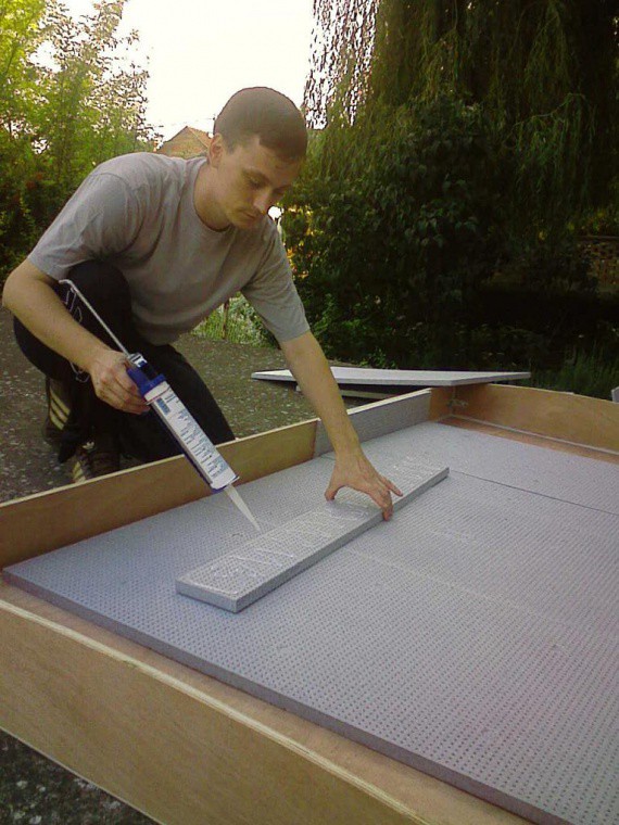 8. Coloca un panel de aislamiento de fibra de vidrio o de espuma. Las aberturas para la entrada y salida de aire deben ser rodeadas cuidadosamente por el aislante.