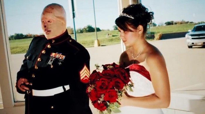 - Tai Siegel y Renee Klein decidieron casarse, cuando aun la cara del novio era normal. Todo cambió después de que este sirviera en Irak, donde resultó ser víctima de una explosión suicida. Después de pasar por 50 operaciones, los médicos lograron salvarle la vida.