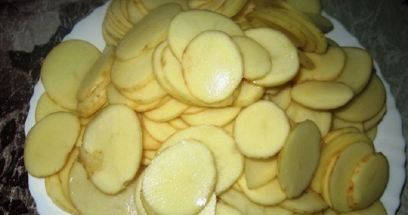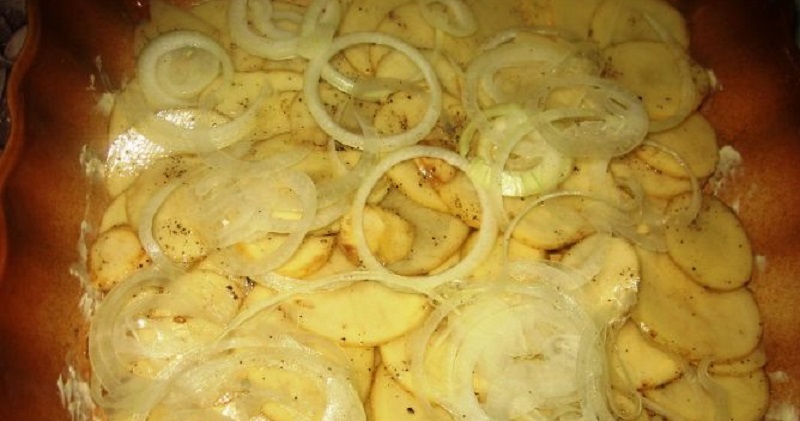 1. Limpia las patatas y córtalas en rodajas finas — alrededor de 2 mm de espesor. Es conveniente hacerlo con una rebanadora de vegetales común. Corta la cebolla en aros finos. Agrégale la sal y pimienta a las patatas rebanadas.