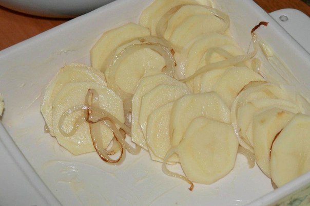 5. Engrasa la cazuela abundantemente con la mantequilla. Coloca la papa en el fondo, poniendo entre las rodajas los aros de cebolla. Échale la sal y pimienta al gusto. Añade una pizca de nuez moscada, verduras y el ajo.