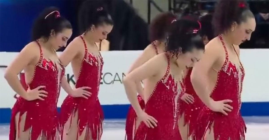 Estas bellas jóvenes, vestidas de escarlata-y-lentejuelas, son atletas del equipo 2 de Canadá, que competió en el Campeonato mundial de patinaje sincronizado, del 2015.