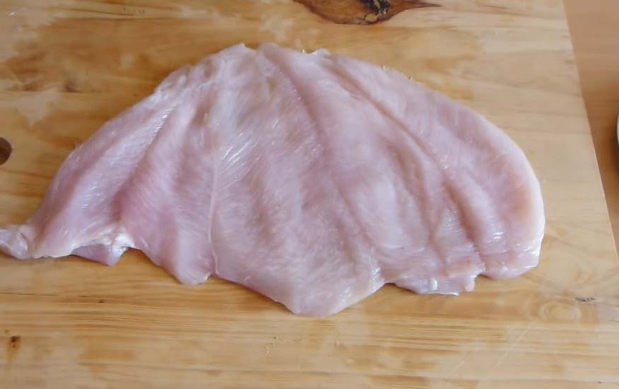 - Corta la pechuga de pollo por la mitad y ponla sobre una superficie plana.
